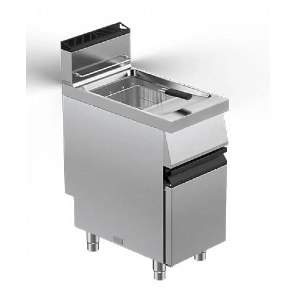 Vasca di cottura in acciaio inox AISI 304, senza giunzioni, con bordi ampiamente raggiati per una pulizia più facile ed efficace. Scambiatori di calore di forma ellittica all'interno della vasca di cottura. Questa forma ellittica degli scambiatori di calore è progettata per aumentare la superficie di scambio termico con l'olio e, allo stesso tempo, per ridurre la superficie esposta al contatto con i residui di cottura, migliorando la protezione dell'olio. Zona fredda per la stabilizzazione dei residui di cottura e scarico olio inferiore Ø1 pollice con valvola a sfera. Controllo meccanico tramite valvola di sicurezza e termocoppia, non richiede alimentazione elettrica. Accensione pilota piezoelettrica. Termostato di sicurezza a riarmo manuale. Dotazione: 1 cestello per versioni con 1 vasca. Vano inferiore chiuso da porta incernierata in acciaio inox AISI 304, apertura verso sinistra, alveolare e con cerniere a chiusura assistita e maniglia ergonomica salvaspazio.